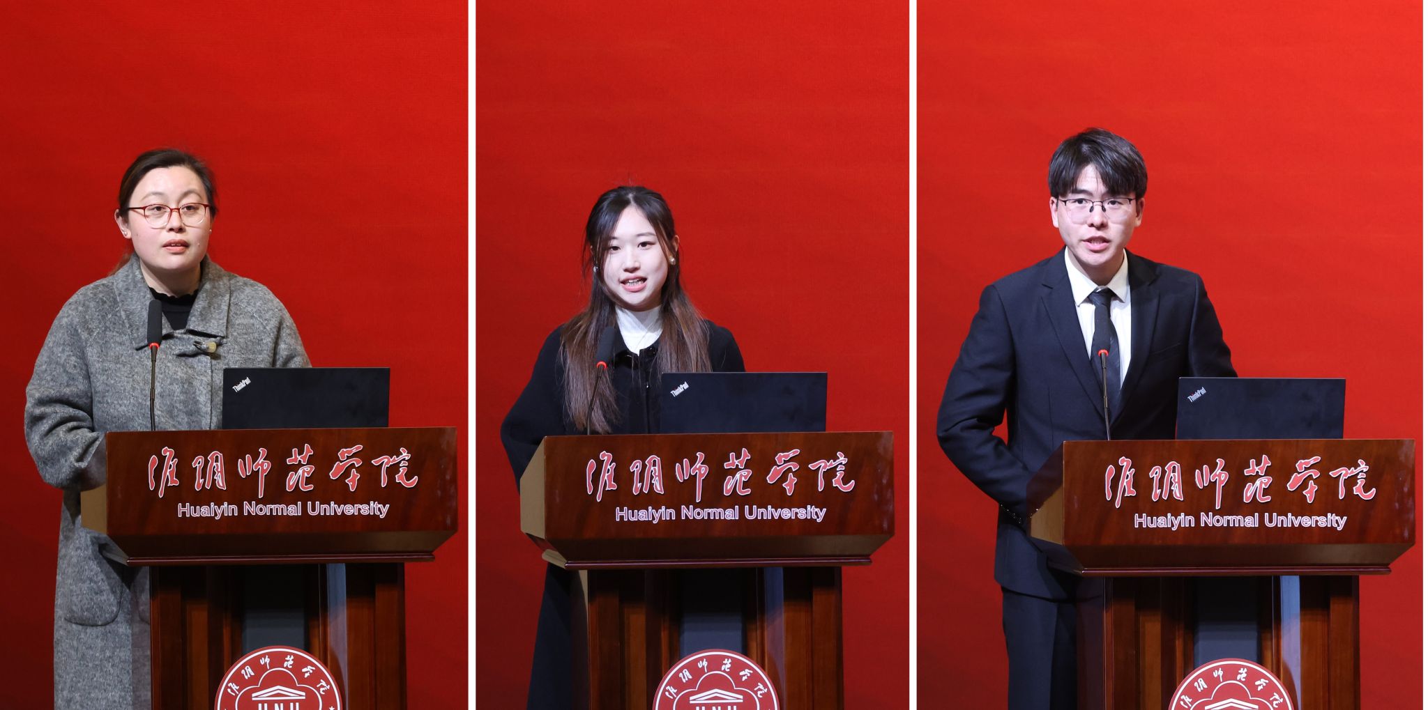 物理与电子电气工程学院党委副书记马娟、商学院学生吉心悦作为师生代表发言,2023年度主题教育月先进班级美术学院2003班班长杨林作经验分享。