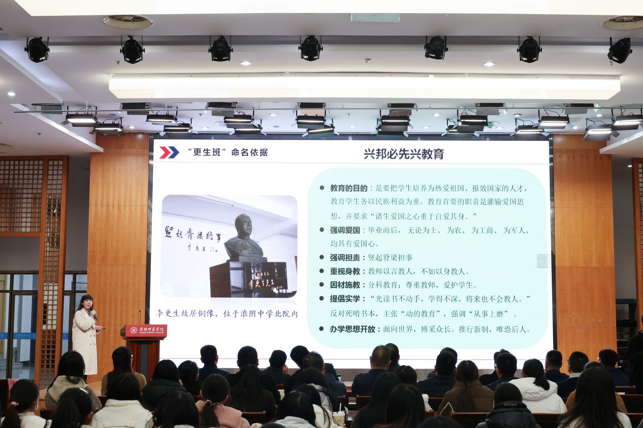 许芳红围绕卓越教师培养历史和成效、“更生班”命名理据、“更生班”建设内涵等方面介绍了更生班的命名由来、建设思路。她说,“更生班”致力于培养新时代教育家型中学语文教师,以“爱国、担当、博采、日新”为班训,以坚守李更生爱国主义教育思想、践行李更生民主治学理念、延续李更生开放办学态度、贯彻李更生实践教学原则等为建设举措。她希望同学们践行更生先生教育理念、弘扬更生先生教育精神、彰显淮安本土教育家标识,打造淮师文学院师范生培养品牌,为成为新时代教育家型中学语文教师而努力奋斗。