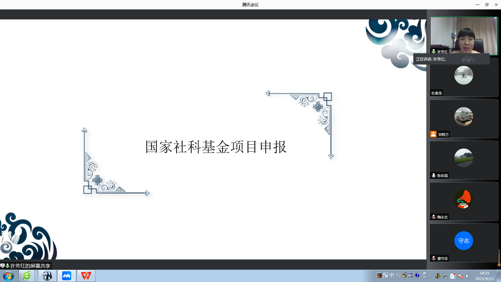 淮师新闻网9月24日电(记者 杜春龙)9月22日下午,文学院召开2022年国家社科基金项目申报线上动员会。院长许芳红作动员讲话并提出了工作要求,副院长陈年高主持会议,文学院全体教师参加了会议。
