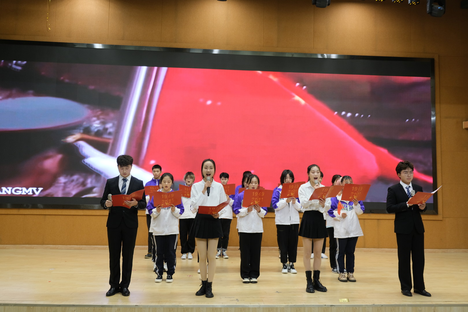 活动期间,由传媒学院关工委副主任柳邦坤教授作词,传媒学子朗诵的《出发,我们在路上》响彻会场,让现场观众听到了百年征程的波澜壮阔,也感受了传媒青年的力量。传媒学院吉祥物“荣荣”“美美”的登场,掀起来现场的高潮。他们表达了传媒学院“融”汇过去与未来和创造美、发现美、接受美、学习美的追求。