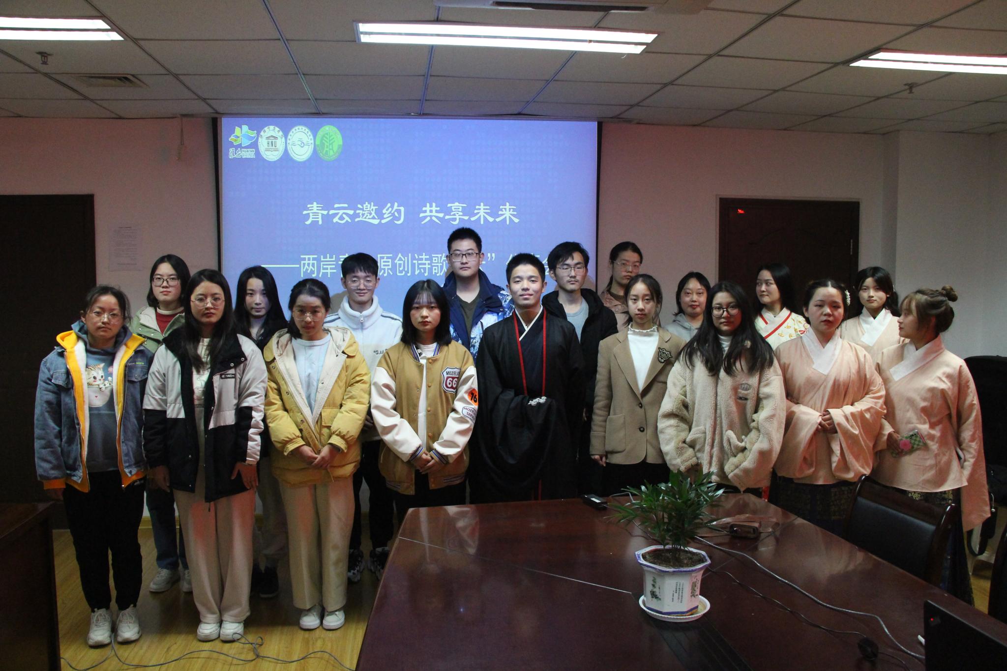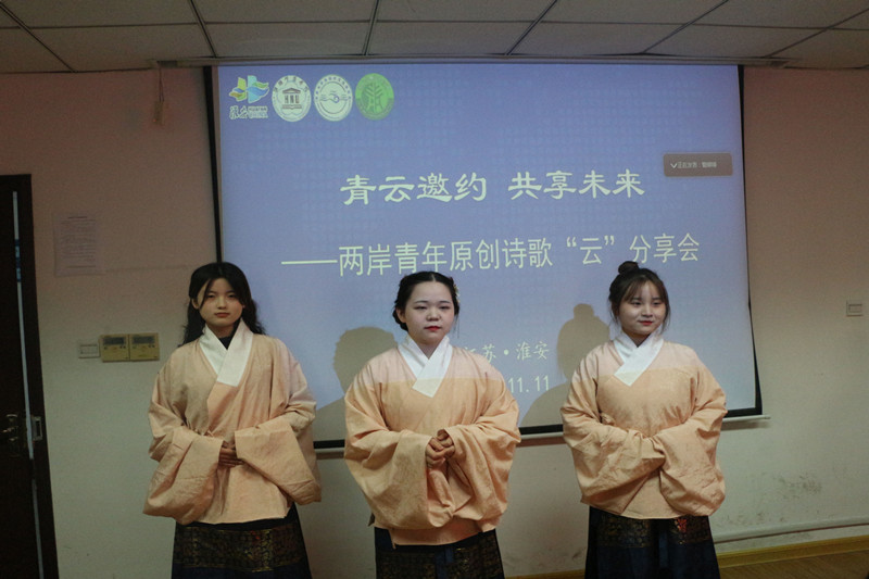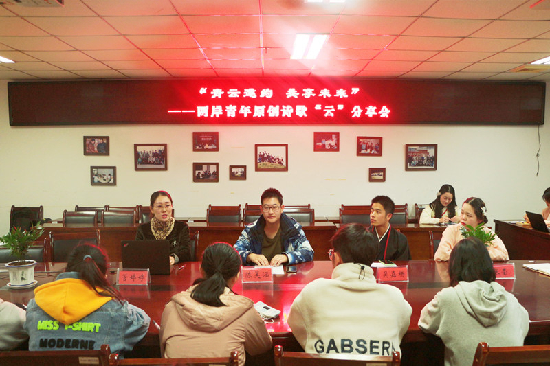 淮师新闻网11月16日电(记者 朱明宇 王倩倩)11月11日下午,文学院在会议室举办“青云邀约共享未来——两岸青年原创诗歌‘云’享会”。淮师采菊诗社、原创诗词作者和台中科技大学等两岸高校大学生们通过线上线下的方式吟诗表意、共话运河情谊。学院学工办主任管婷婷参加线下分享会,1901班陈昊涵同学主持分享会。