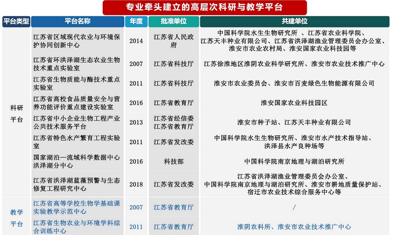 依托省教师教育实践教育中心(我校教科院牵头),开展生物科学师范生的教学教育技能训练;依托省生物农业与环境学科综合训练中心等平台,训练学生的专业实验与实践技能;依托省环洪泽湖生态农业生物技术重点实验室、省协同创新中心、省工程中心等平台,与科研院所、企业联合培养创新创业人才,并拓展国际化视野。
