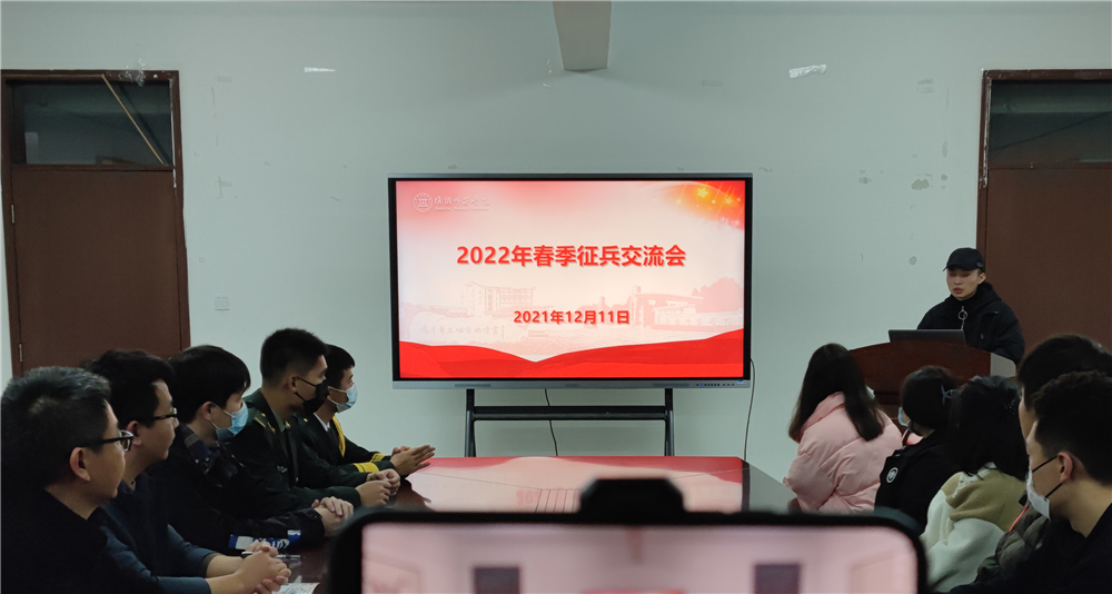 12月11日晚,校人武部在学生处会议室通过“线上+线下”的方式召开征兵宣传咨询会,校人民武装部副部长戴云、国防教育科谷雷、64名意向入伍学生、6名征兵形象代言人参加了活动。谷雷对入伍流程、优先优待、选用培养、复学升学、就业服务、应征条件、优惠政策等相关问题进行了详细说明。退伍老兵刘艺伟现场演示了网上报名操作流程和注意事项,孙辉彬、林宇、杭子懿、朱雨瑾等用自己的军旅故事来感召并带动身边青年学生报名参军入伍。戴云希望同学们要提高思想认识、坚定理想信念、把握政策条件、熟悉程序方法、强化沟通交流、提升综合素养,在部队这个大学校、大熔炉中成就自我,为学校和学院增光添彩,为国防建设奉献自己的青春力量。