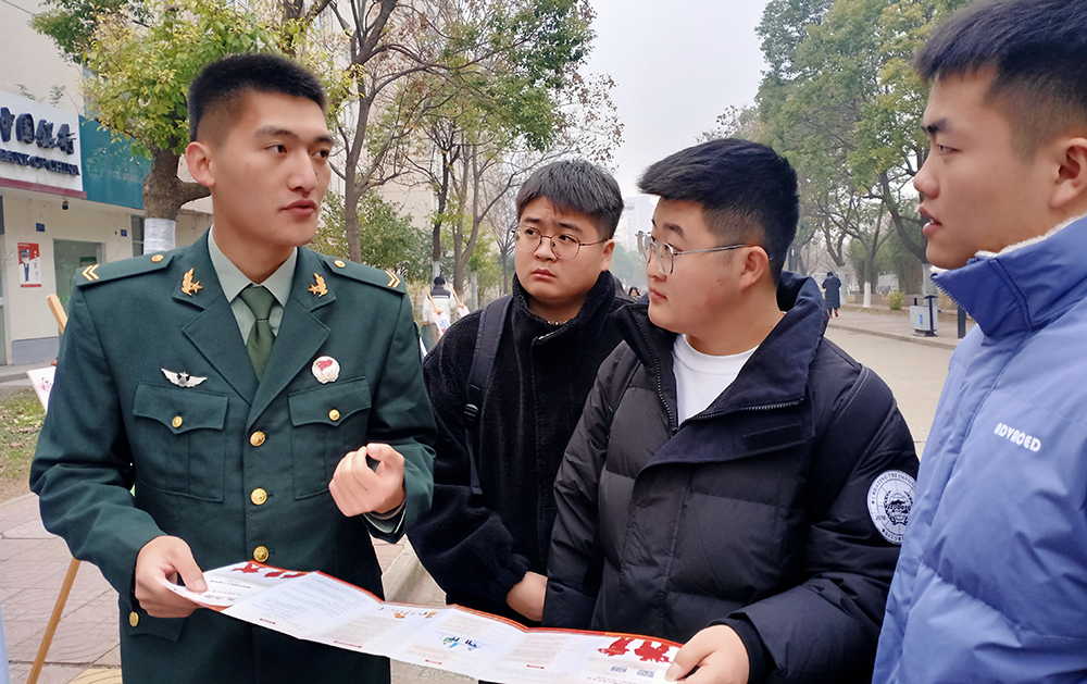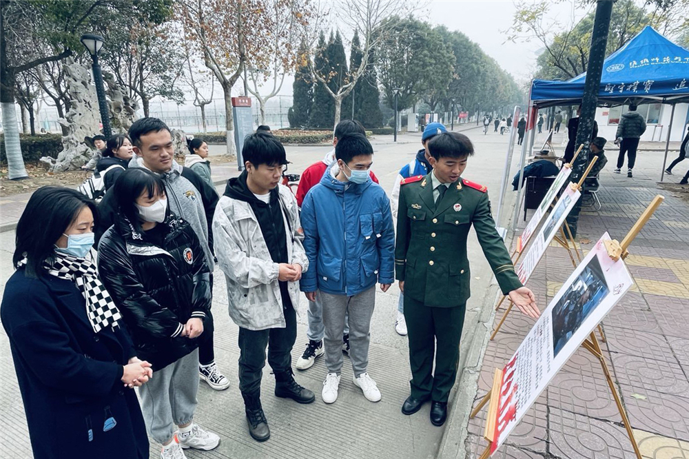 精心从校烽火先锋社挑选8名优秀的退役复学大学生作为2022年春季征兵形象代言人,积极参加学校组织的征兵宣传活动。11日全天,通过在校内设立咨询台、摆放宣传展板、发放宣传手册、悬挂横幅、现场咨询等形式,现场开展政策答疑、建立微信咨询群等方式,全方位解读将军队发展、军人地位、入伍前途、入伍的优惠政策等等。