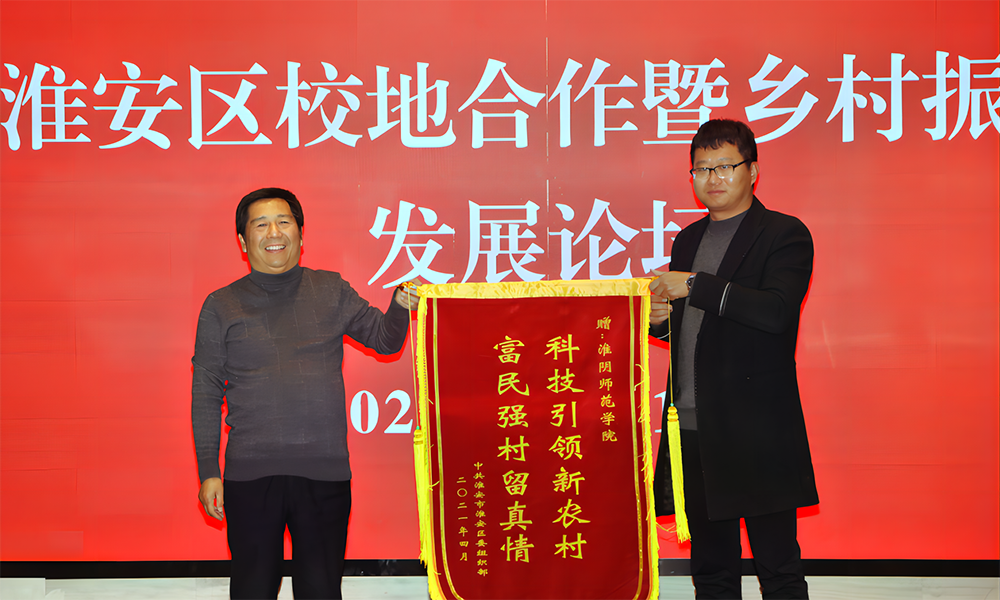 图为罗松源转交了中共淮安区委组织部向淮阴师院赠送的锦旗。记者 顾锦雯 摄