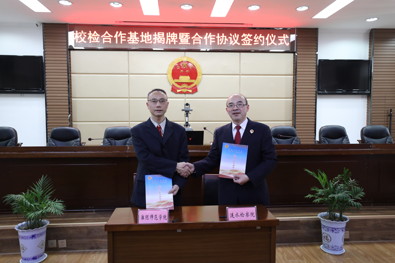 淮师新闻网12月23日电(记者 郭兴利)为深化法学专业人才培养机制改革,推动学科建设与检察实践有效融合,强化学院社会服务工作,12月22日下午,beat365官方网站法政学院与涟水县人民检察院举行校检合作基地揭牌暨合作协议签约仪式。涟水县人民检察院党组书记、检察长龚怀军,党组副书记、副检察长钮立祥,党组成员、政治部主任徐建明,beat365官方网站学报编辑部主任季秀平,法政学院院长刘晓苏、副院长郭兴利、法学系主任许健等出席活动。