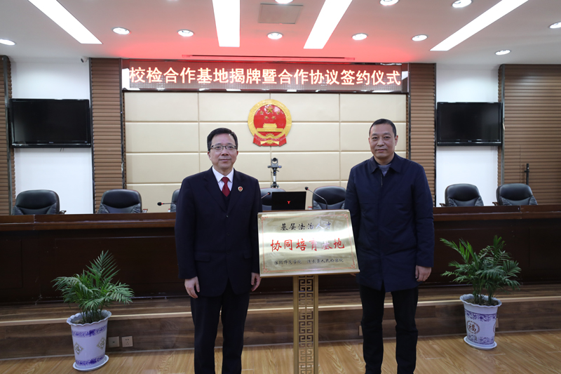 徐建明与郭兴利代表双方签署检校合作协议。龚怀军与刘晓苏共同为“基层法治人才协同培育基地”揭牌。
