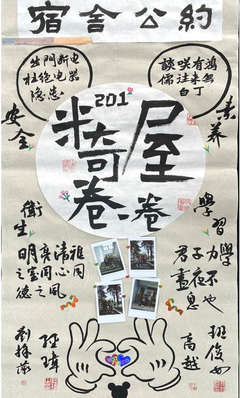 尚艺先行,结合专业特长展风采。学院积极探索思政育人与专业特色融合新思路,重视宿舍文化内涵建设。组织学生开展公寓墙绘和书法创作,美化公寓环境;开展“爱寝行动”宿舍文明公约创意设计比赛,“寓”你携手,一见“寝”心宿舍装饰设计比赛,鼓励学生学以致用,将手工编织,书法,海报设计等专业技能用来美化宿舍环境,展示自己的专业特长。