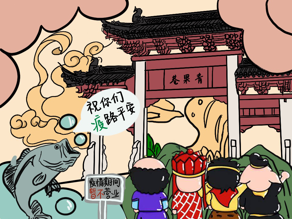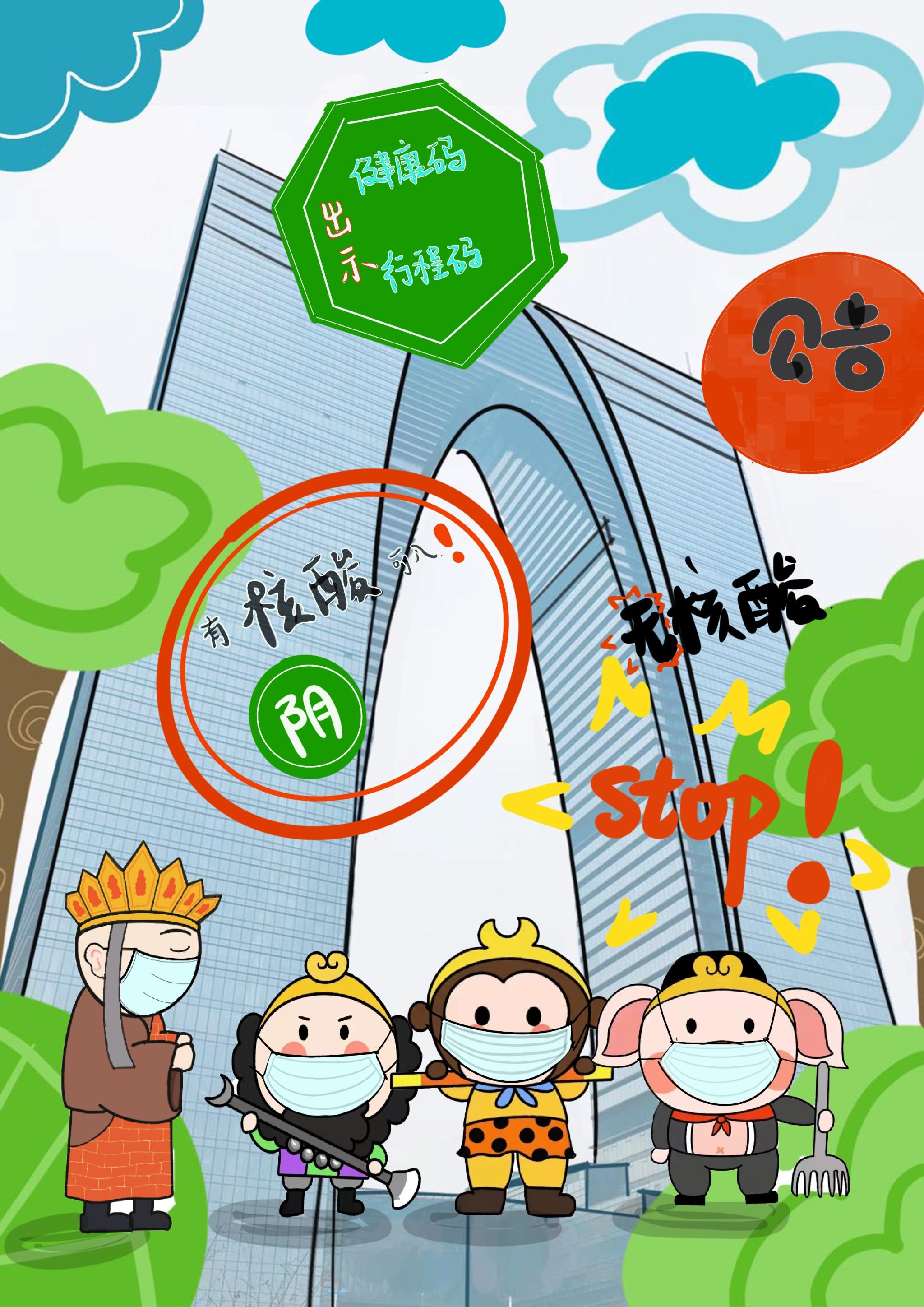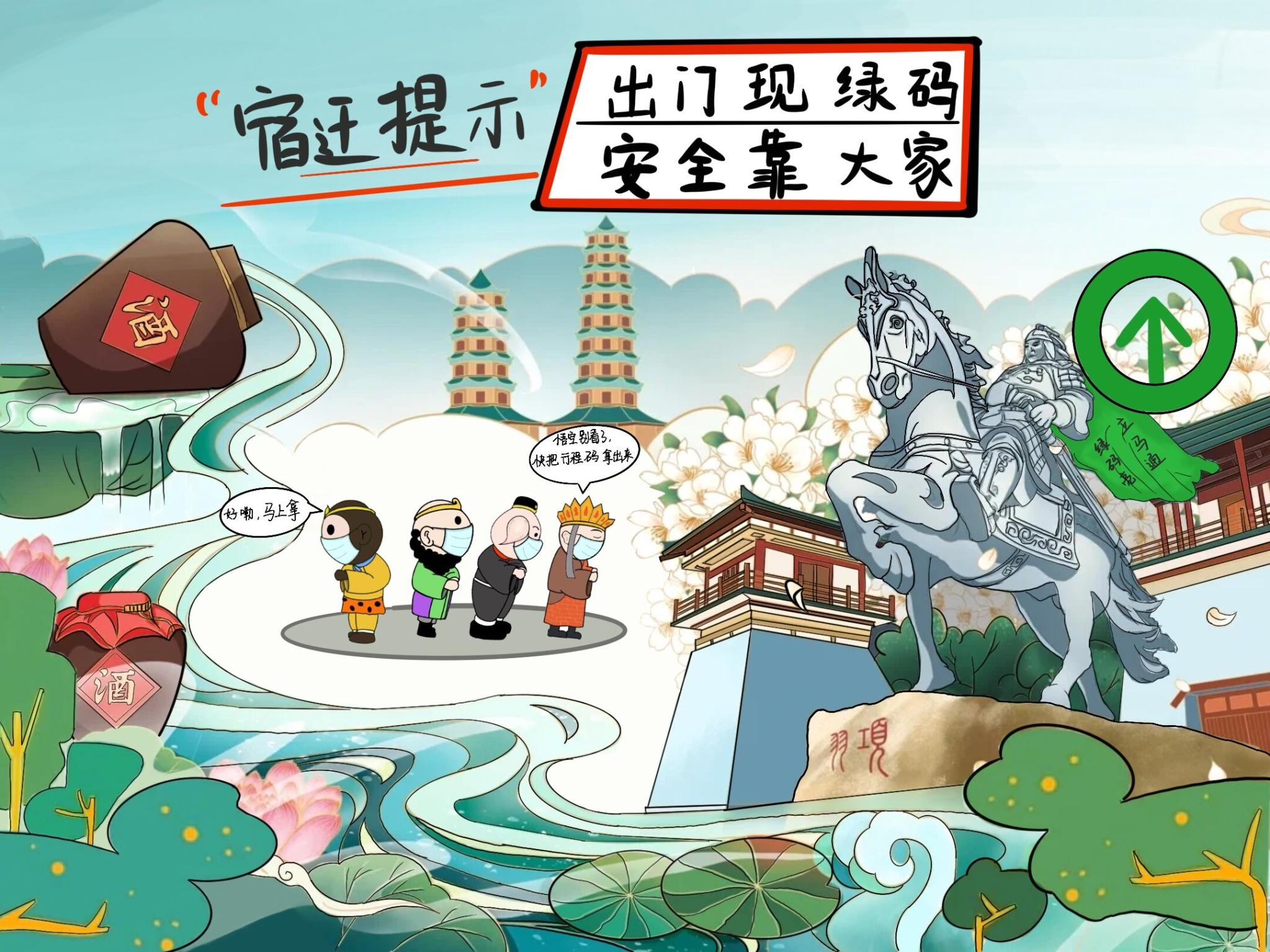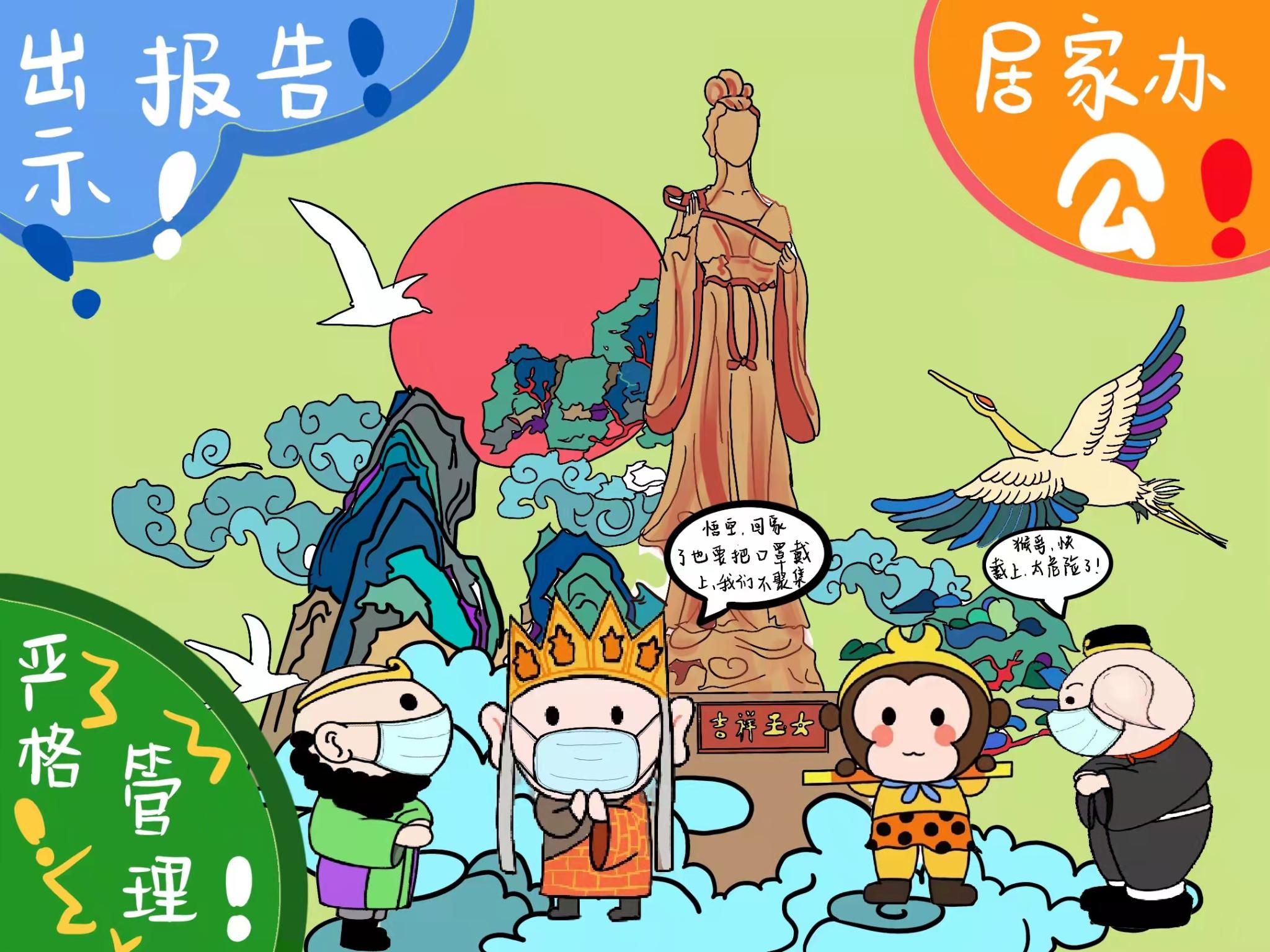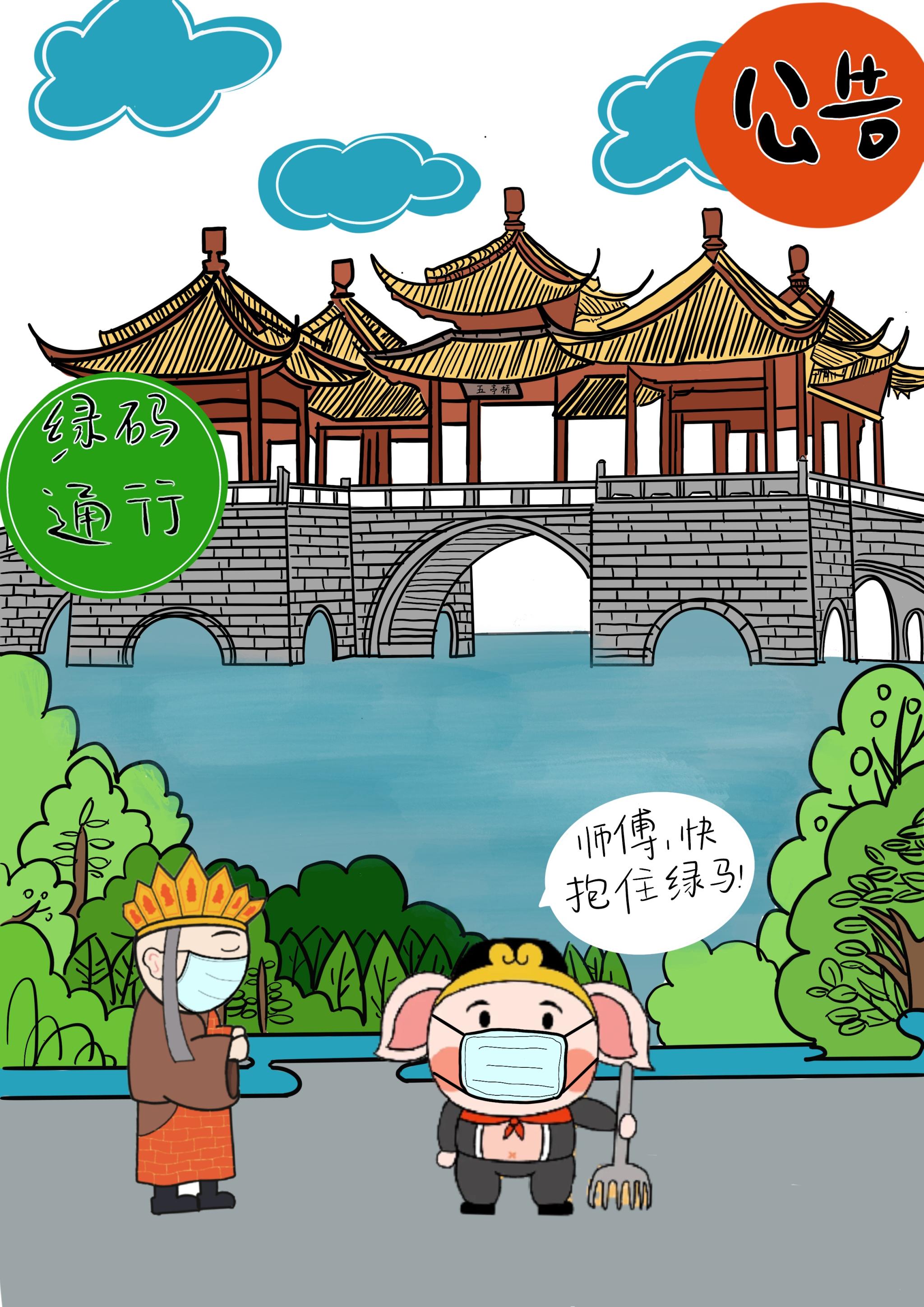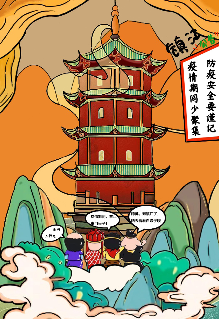 淮安是《西游记》的发源地,美院学子利用“唐僧师徒四人”卡通形象发挥想象进行创作,将“唐僧师徒四人”的卡通形象化身“疫情防控宣讲团”对防疫事项进行宣传。以江苏省13个地级市作为背景,针对各地特色,结合各地疫情防控要求,通过漫画的形式引导大家掌握防疫知识,自觉遵守防疫要求,不聚集,不乱跑,加强防疫期间自我防护,共同构筑疫情防线。