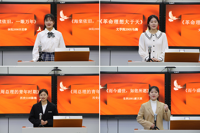 经过初赛遴选,来自各学院的10位选手,或结合自己的特长,或结合自己的专业声情并茂地讲述周总理崇高品质与伟人风范,演绎了一场令人动容的思想盛会。历史学院2105班陈锦通过讲述青年周恩来刻苦奋进、立志报国的爱国故事,强调了当代青年主动担起时代使命和责任的重要性。文学院2005班马腾以“革命理想大于天”为题,深情诠释了周恩来将《共产党宣言》奉为人生圭臬,为之坚持到生命最后一刻的坚毅执着精神。同时,马腾引用周恩来写给友人的信中原句“愿相会于中华腾飞世界时”,激励当代青年要勇做走在时代前列的奋进者、开拓者、奉献者。时光易逝而精神不逝,生科院2001班郝天琪带领我们穿越时空,纵观总理一生,深切感受周恩来鞠躬尽瘁、死而后已的无私奉献精神。参赛选手们还从周恩来诗词的为民情怀、周恩来的留学经历以及周恩来与邓颖超之间的爱情故事、革命情谊等角度,全方面、多层次地展示了周恩来总理的崇高精神、高尚品德和伟大风范。