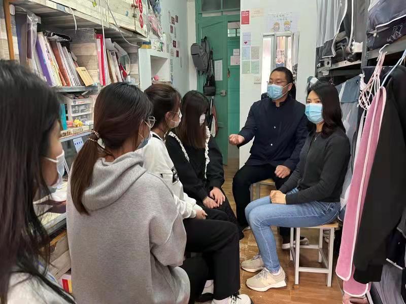 学院班子成员、辅导员老师与学生面对面交流,就学生的学习情况、生活情况、心理需求、思想动态和安全防护等情况进行详细了解,引导学生正确看待并遵守当下的疫情防控规定,并对学生提出的问题及时给予解答。