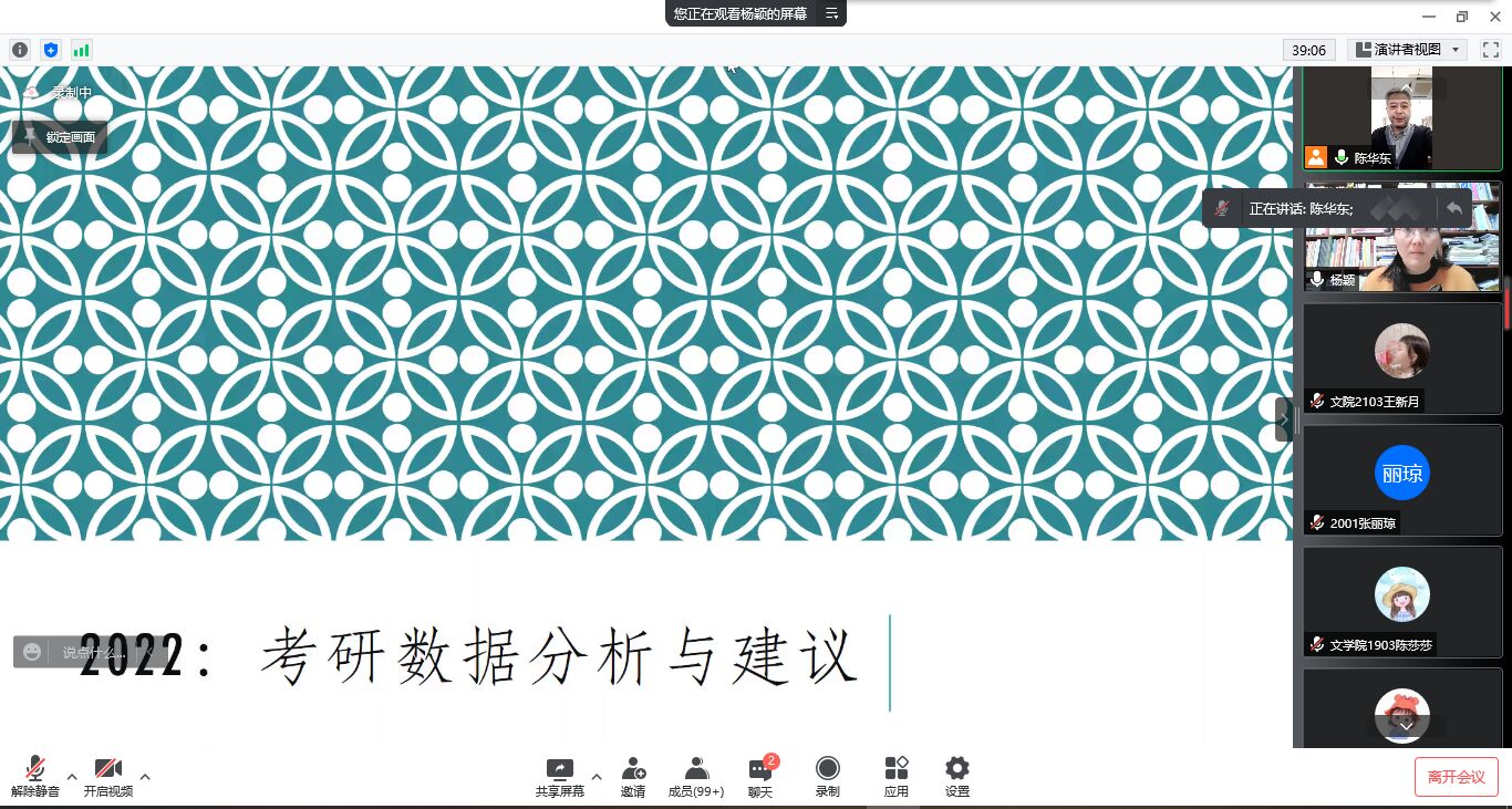 杨颖向同学介绍了文学院近几年考研形势和成绩。2016年到2021的考研数据对比充分展示了文学院较高的考研成功率。她说,考研虽有挑战,但同时也充满机遇。她对考研同学提出两点建议,一是要正确认识自己,树立积极目标,多向学长学姐取经;二是要充分利用好文学院的导师制度,增加与考研导师的交流沟通。陈华东在发言中指出,考研是一个提升层次、提高就业竞争力的机会,希望每一个同学都能把握机会、充实自我。