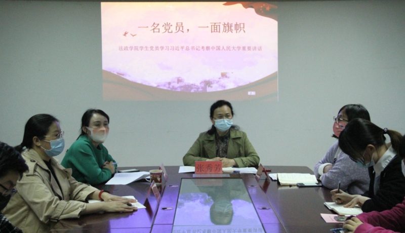 淮师新闻网5月4日电(记者 朱凤祥)5月2日晚,法政学院在会议室开展“一名党员 一面旗帜”专题教育活动,学习习近平总书记在中国人民大学考察时的重要讲话精神。法政学院党委书记张秀芳、学生党支部书记唐昕、周翠、学生党员参加专题教育活动。活动由法政学院党委副书记孙慧玲主持。