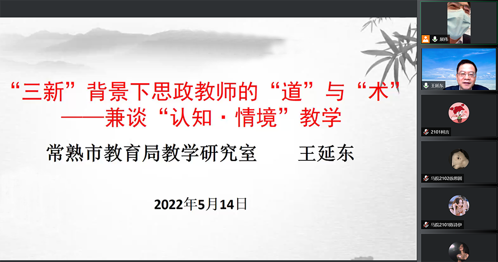 淮师新闻网5月16日电(记者 柯言)5月14日上午,马克思主义学院邀请特级教师、正高级教师,第三届苏州市教育领军人才,常熟市高中政治教研员兼德育教研员王延东走进思政课堂,探讨“三新”背景下中学思政教师的“道”与“术”,讲授“认知•情境”教学。活动通过线上方式举行。马克思主义学院部分专业课教师、思政专业全体学生到会学习,讲座由马克思主义学院院长展伟主持。