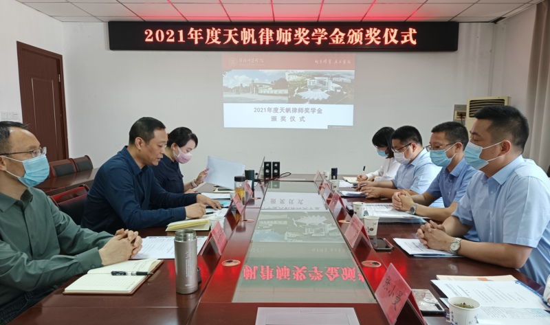 淮师新闻网5月31日电(记者 朱凤祥)5月30日下午,法政学院在会议室举办“天帆律师奖学金”颁奖仪式。江苏天帆律师事务所主任赵金斗,执行主任、法学专业2009届校友戴号,法政学院院长刘晓苏、副院长郭兴利出席了颁奖仪式。2018级获奖学生线上线下参加了颁奖仪式。颁奖仪式由法政学院党委副书记孙慧玲主持。