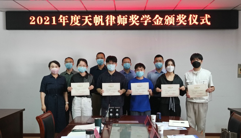 戴号宣读2021年“天帆律师奖学金”获奖学生名单,对获奖学生表示祝贺。天帆律师奖学金(法考冠军奖)张睿作为获奖学生代表进行发言。赵金斗、刘晓苏为获奖学生颁发“天帆律师奖学金”证书。
